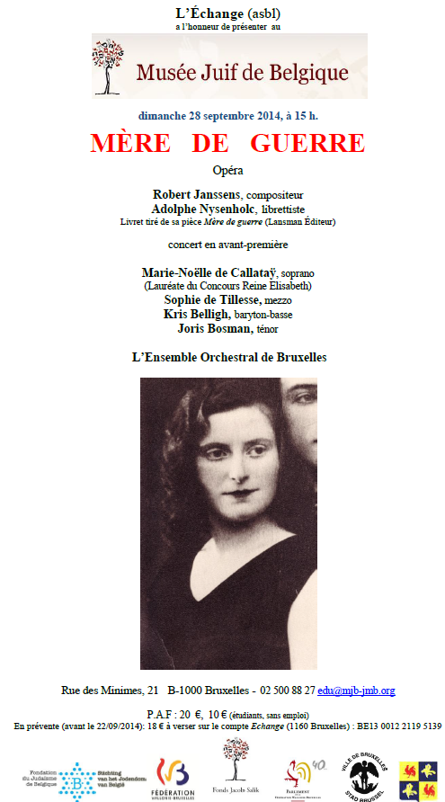 Musée Juif de Belgique, création de l'opéra en concert, livret d'Adolphe Nysenholc, musique de Robert Janssens, avec Marie-Noëlle de Callataÿ, Sophie de Tillesse, Kris Beligh, Joris Bosman, le 28 septembre 2014, 15h.