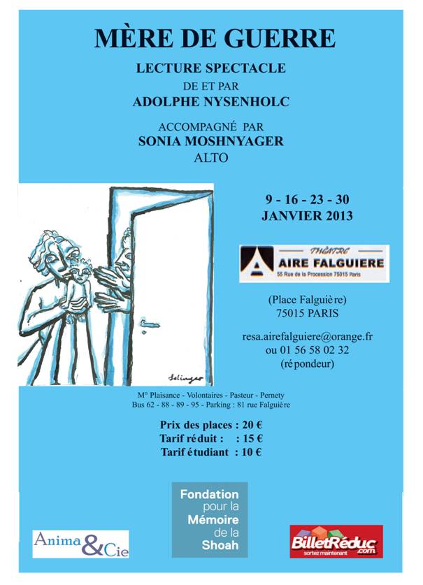 Théâtre Aire Falguière, Prod. Anima & Cie d'Annie Rappoport, lecture-spectacle, animé de statuettes, avec Sonia Moshnyager (alto), avec l’aide de la Fondation pour la Mémoire de la Shoah, Paris, 9, 16, 23, 30 janvier 2013, 21h