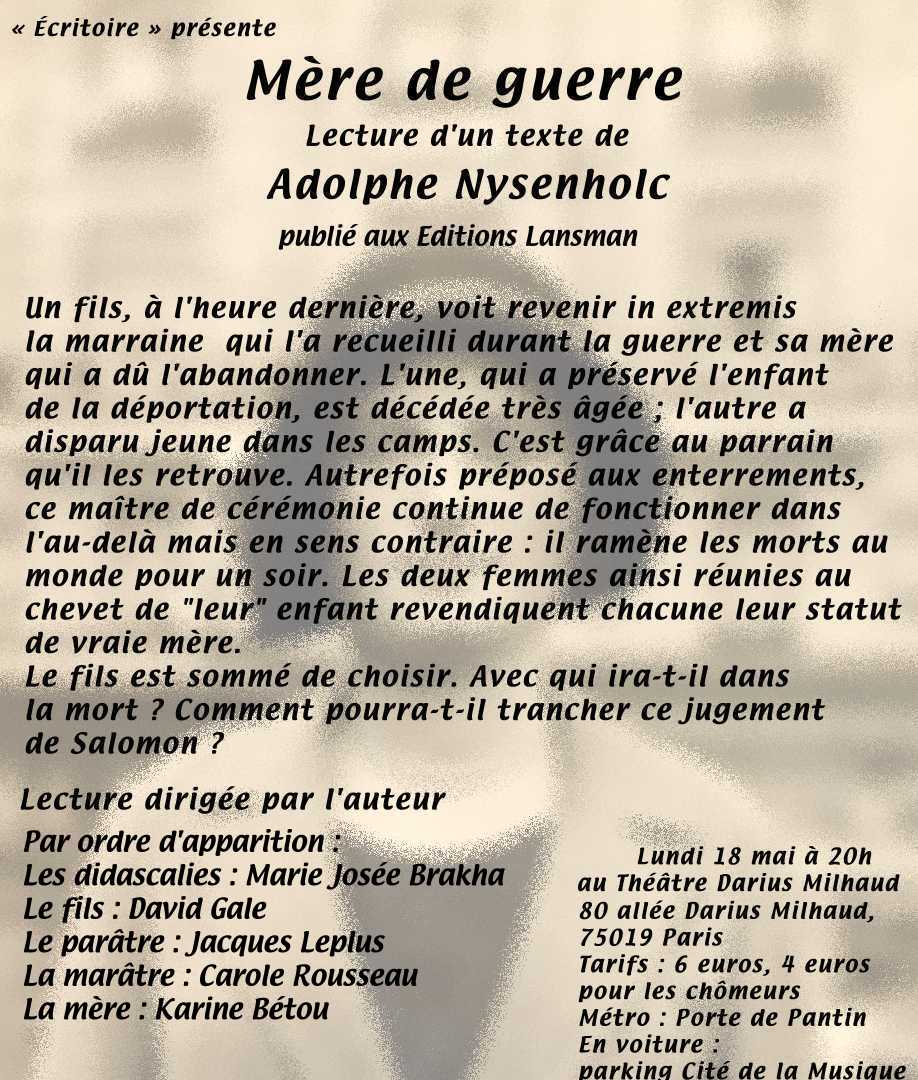 Théâtre Darius Milhaud, lecture scénique dirigée par l'auteur dans le cadre d' "Ecritoire", avec Marie-Josée Brakha, Karine Bétou, David Gale, Jacques Leplus, Carole Rousseau, Paris, le lundi 18 mai 2009, 20h (voir affiche en attaché : 166 Ko)