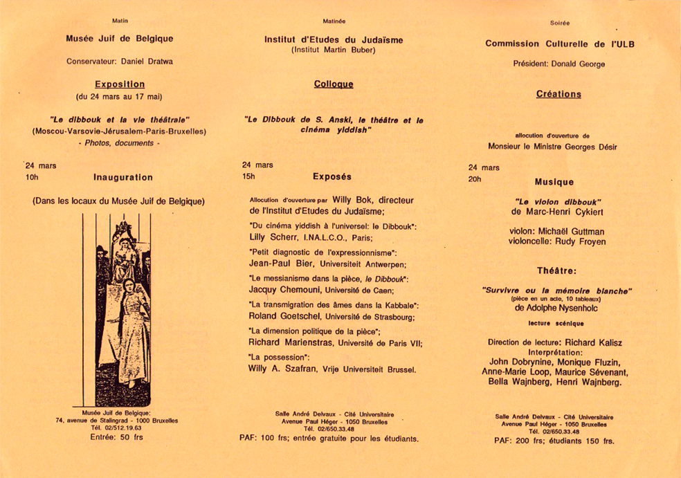 • Salle André Delvaux (Université Libre de Bruxelles), dans le cadre d'une Journée sur le thème du Dibbouk, organisé par l'Institut d'Etudes du judaïsme (Martin Buber), le dimanche 24 mars 1991. Interprété par Monique Fluzin, John Dobrynine, Anne-Marie Loop, Maurice Sèvenant, Bella et Henri Wajnberg. Dirigé par Richard Kalisz.